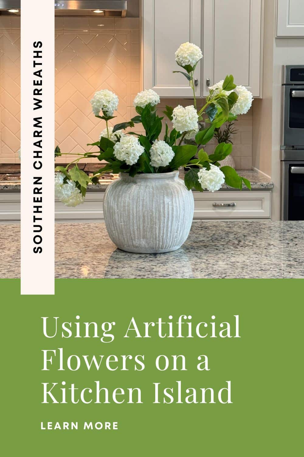 Today we are stepping away from the front door and into the kitchen. I want to show you a couple of artificial flower arrangement ideas to dress up your kitchen counters and island.
