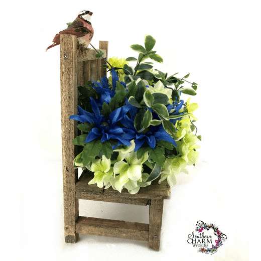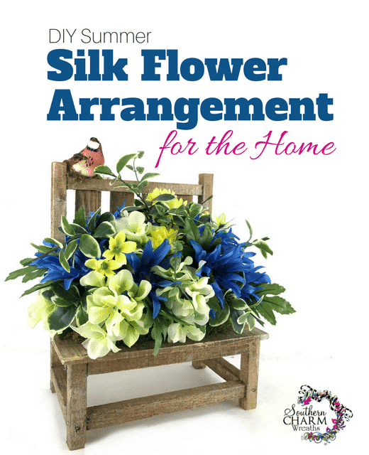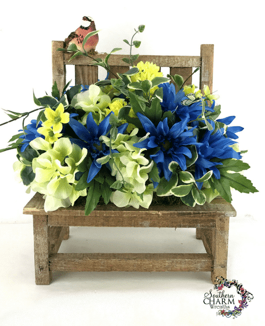 Today I’m making a fun silk flower arrangement using a small bench as the base! I used blues, yellows and whites to make this a great piece for summer but you could use any colors you would like. This post contains some affiliate links for your convenience. Click here to read my full disclosure policy.
