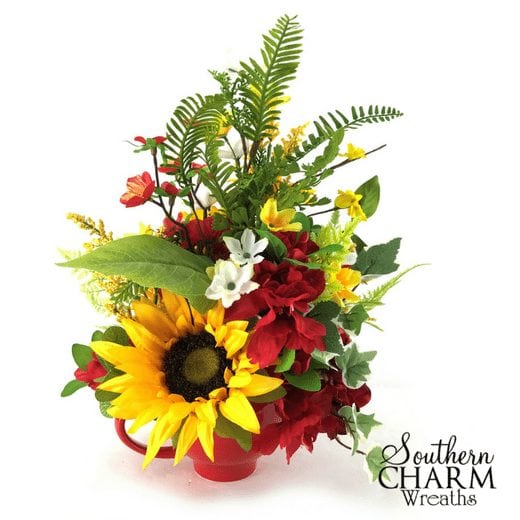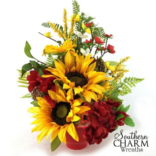 - Next, I added a bush of yellow flowers and greenery to the center. Tip: As you add your silk flowers, remember to place them in various angles and heights. You don’t want all of your flowers straight up and down.