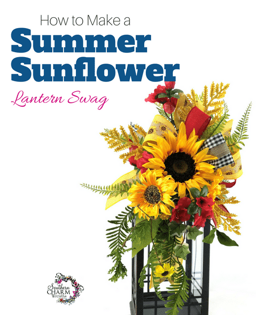 Today in the wreath shop, I’m showing you how to make a Summer Sunflower Lantern Swag using sunflowers and ribbon. In case you didn’t know, a lantern swag is a flower arrangement to place on top of your lanterns to add a pop of color or to help decorate for the holidays. This post contains some affiliate links for your crafting convenience. Click here to read my full disclosure policy.