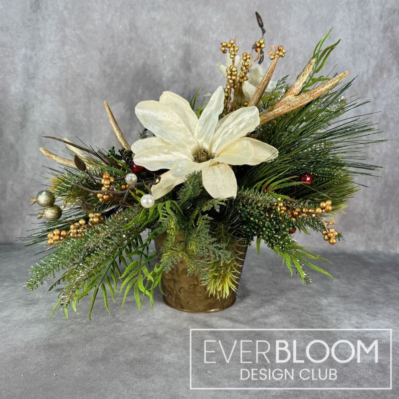 Supply List 1/4 – XP1863 – Garland 1 – XG765-LGOG – Glittered Fraser Fir 1 – 13629GN – Flocked Fishtail Fern Bush 1 – XH527-C – Velvet & Pearl Magnolia 2 – HL9189432 – Antler Ornaments 1 – XG970-MG – Glittered Seed Spray 1 – MET1578 – 6″ x 5″ Container
