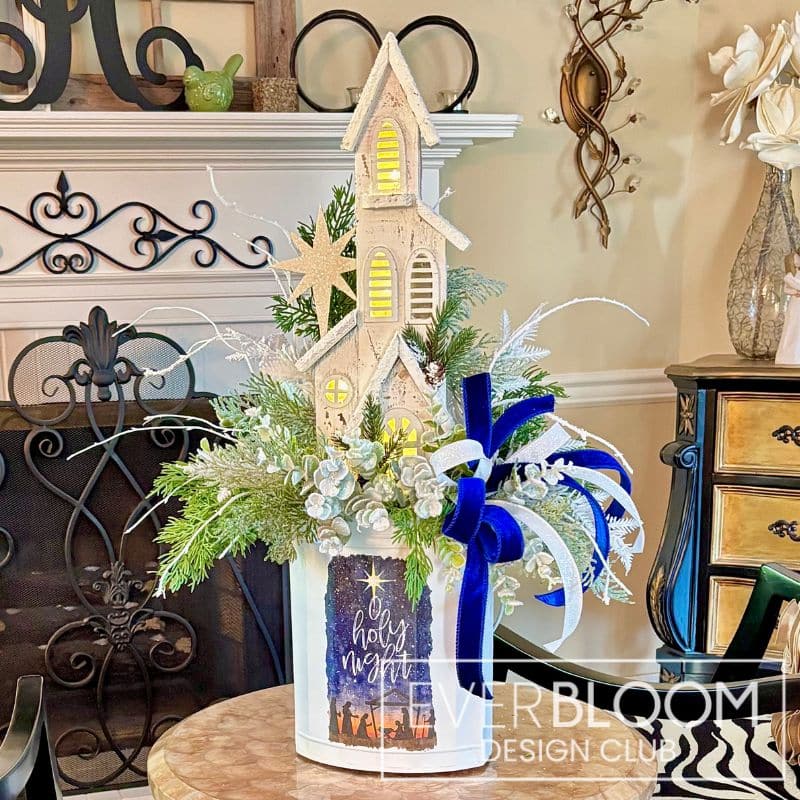 Supply List 1 – 10″ White Metal Container with Handle 1 – O Holy Night Napkin 1 – White Wooden Lighted Church 1 – 23013 – Flocked Cedar Pine 3 – CP1899 – Flocked Eucalyptus 1 – 83611 – White Snow Flocked Mixed Pine Spray 30″ 1 – Wooden White Glittered Star 1 – RGE765825…